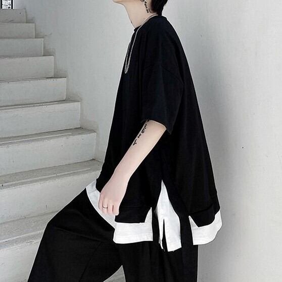 重ね着風 サイドベルト半袖Tシャツ