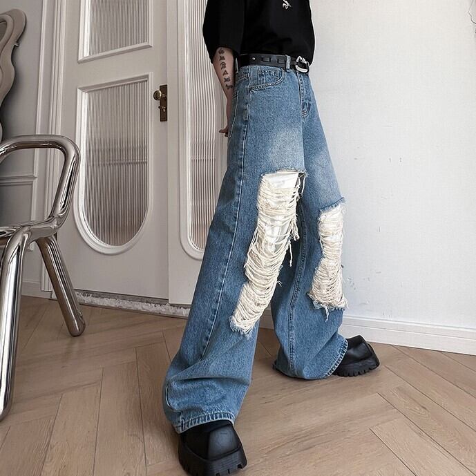 大胆なデザインで、夏場はTシャツやタンクトップ、秋冬はニットやブルゾンなど、様々なトップスとのコーディネートが楽しるダメージジーンズ。