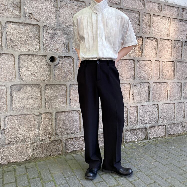 スタンドカラーフラワー柄半袖ドレープシャツ