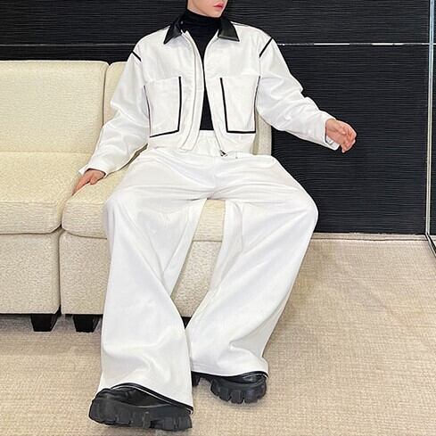 【セットアップ】ショート丈コントラストカラージャケット / ワイドパンツセット